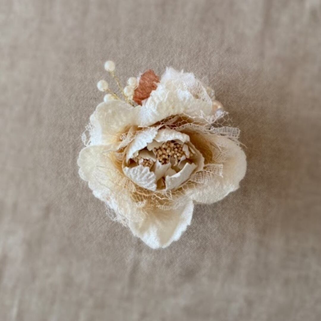 今年人気の柔らかいオフホワイト系のコサージュは、どんなお洋服にも合わせやすく上品なイメージです。