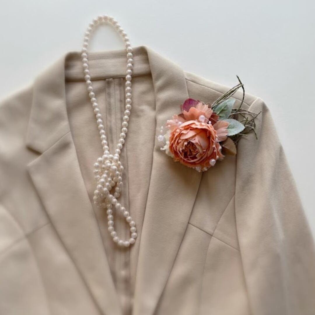 またコートが必要な肌寒い日や、小さなお子様とご一緒の時も、とても扱いやすいアーティフィシャルフラワー(高品質な造花)のコサージュはとても便利です。