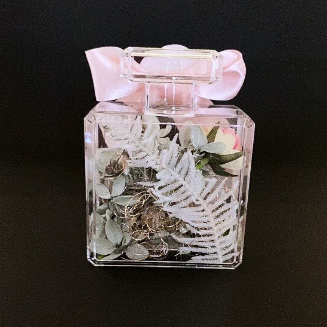 フリル咲きのミニバラと、珍しいグレープラチナ色のアジサイをおしゃれな香水瓶ケースにふんわりと詰めました。