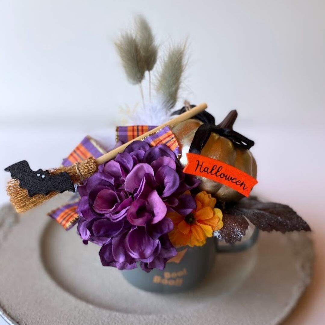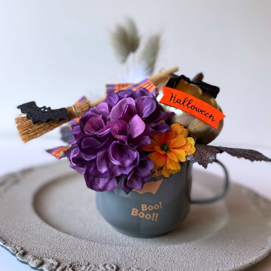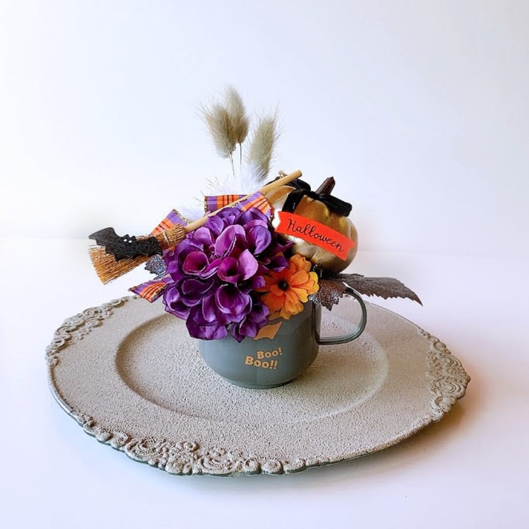 グレーのハロウィンカップにパープルのお花・ゴールドのパンプキンが映えます。
