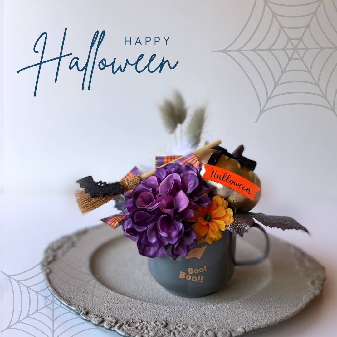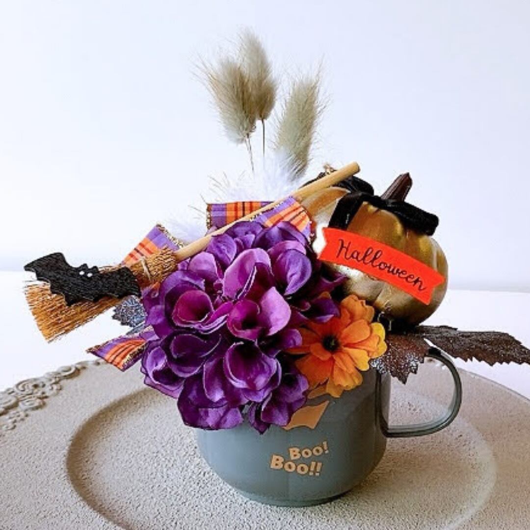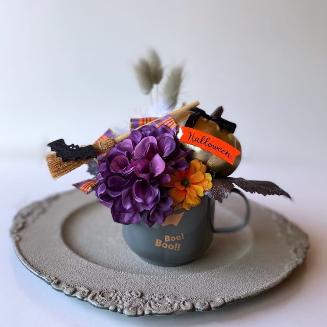 グレーのハロウィンカップにパープルのお花・ゴールドのパンプキンが映えます。