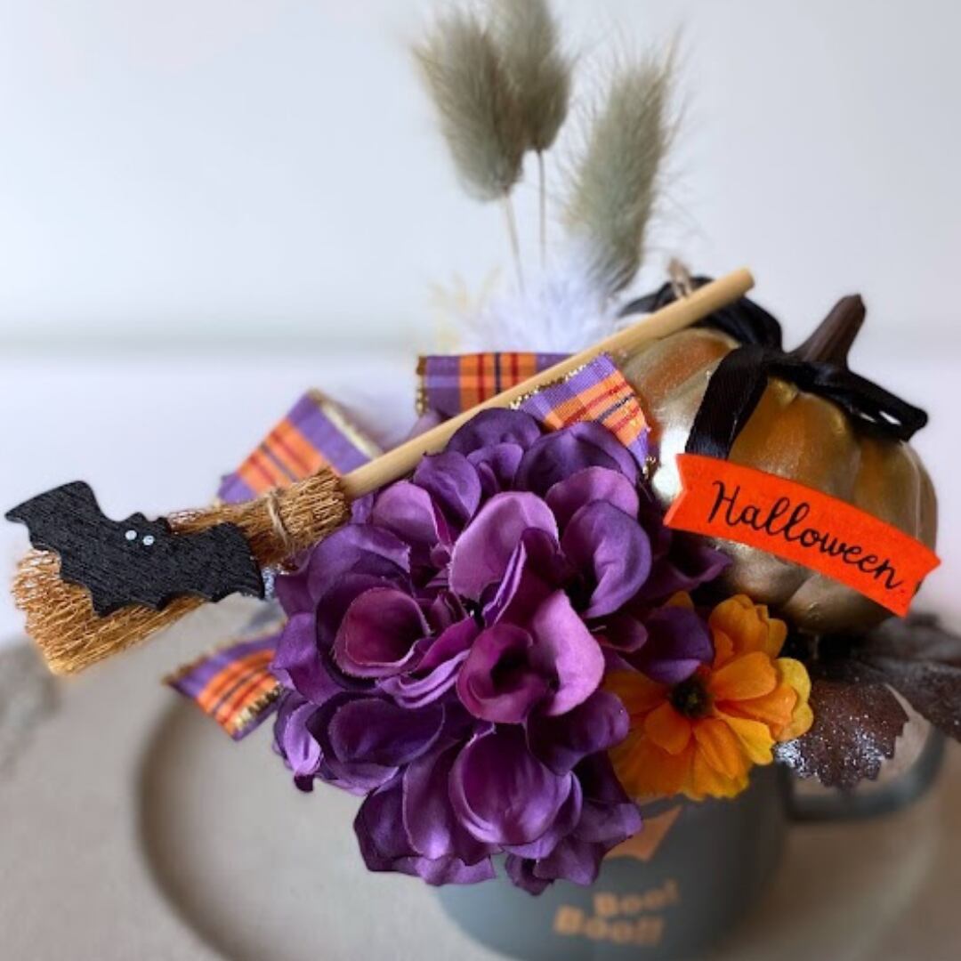 ゴールドのパンプキンをポイントに、ハロウィンカラーのお花を使ったアレンジメントです。魔女のホウキとコウモリで楽しい雰囲気です!