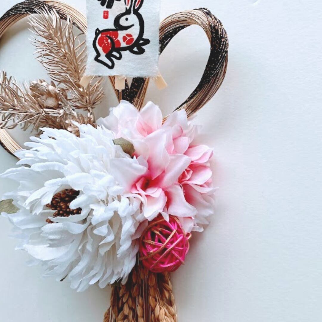 華やかな迎春の雰囲気にピッタリな清々しい白とピンクのお花をあしらいました。