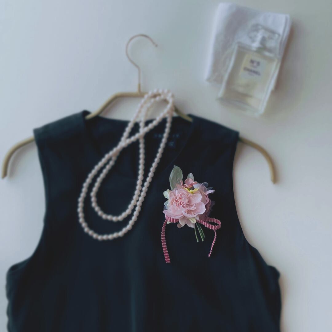 ピンクカラーのコサージュはシンプルな装いでも、