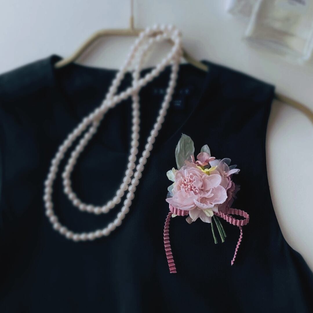 またコートが必要な肌寒い日や、小さなお子様とご一緒の時も、とても扱いやすいアーティフィシャルフラワー(高品質な造花)のコサージュはとても便利です。