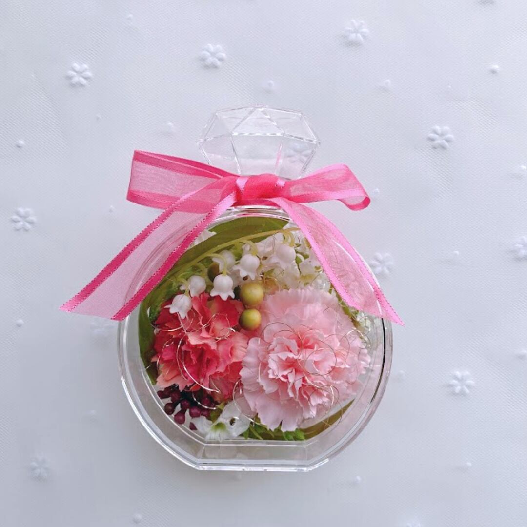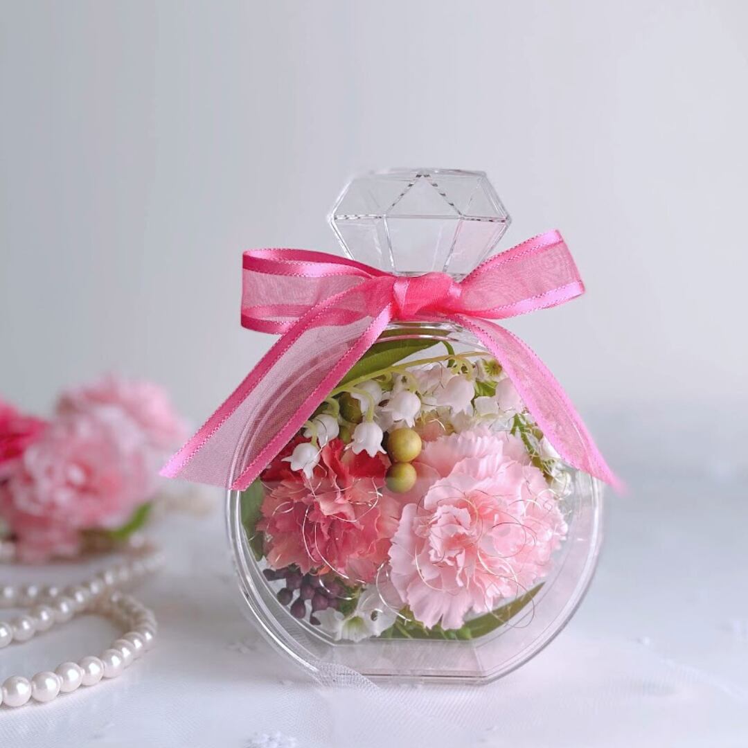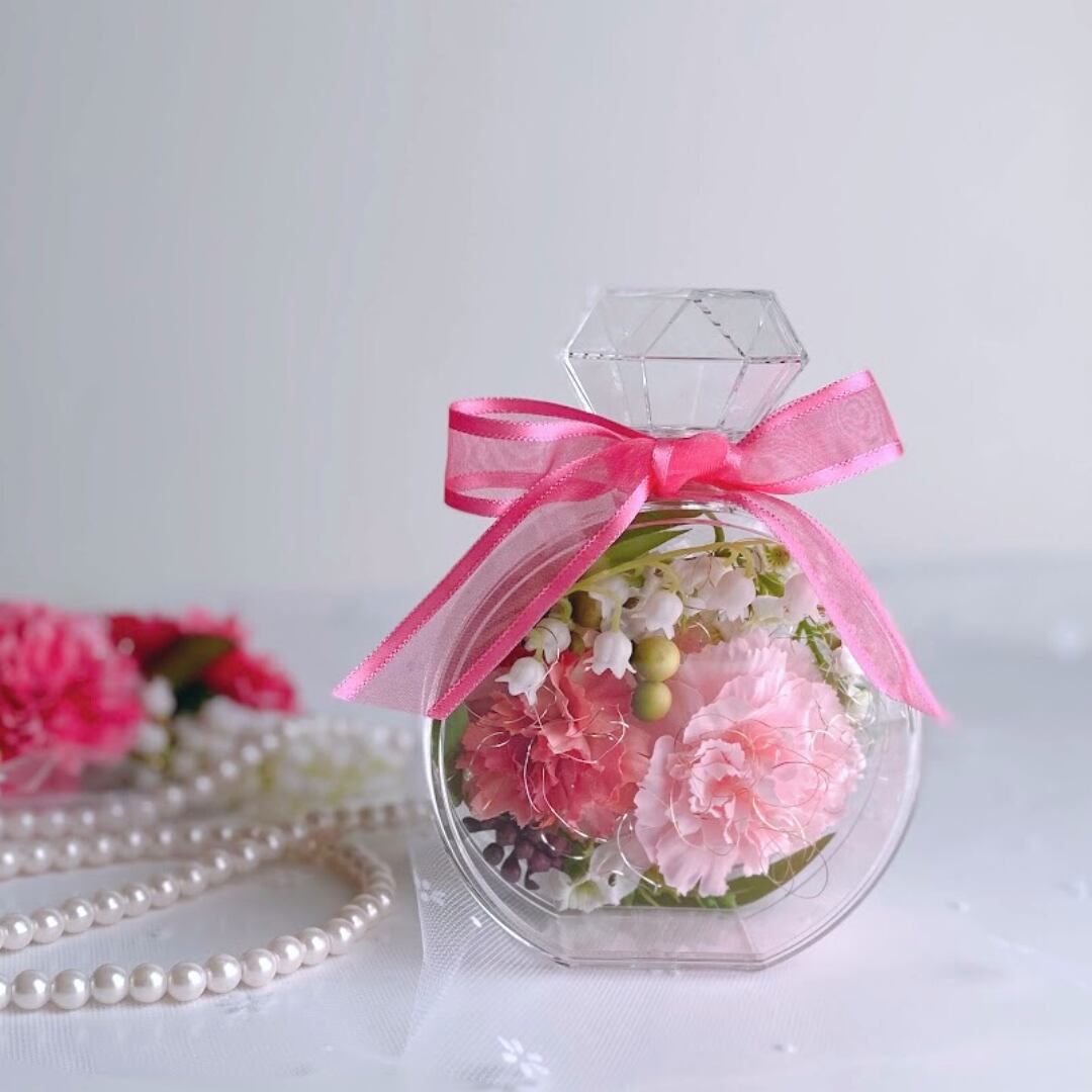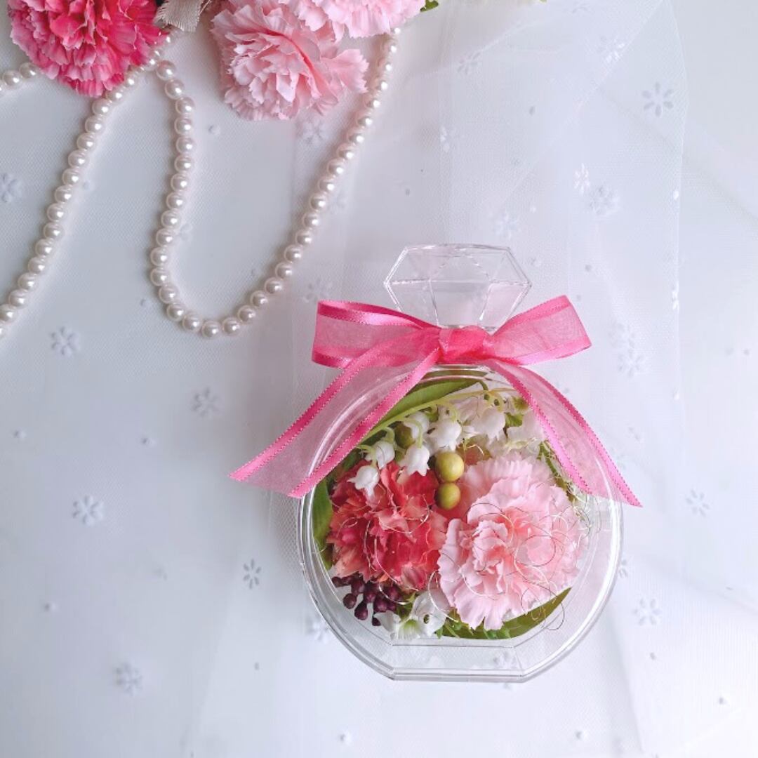 透明な香水瓶のボトルは場所を選ばず置けるサイズなので、母の日のプレゼントにお勧め です。